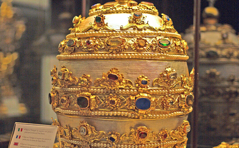 not come from scripture but from those old Mystery Religions. The claims of the papacy to have the authority of God on earth are in their very crown. The triple tiara of the Popes is a claim to rule over heaven, earth, and hell. This is tantamount to claiming to be The Lamb. The pope stands before the world in the place of God, looking like a lamb.